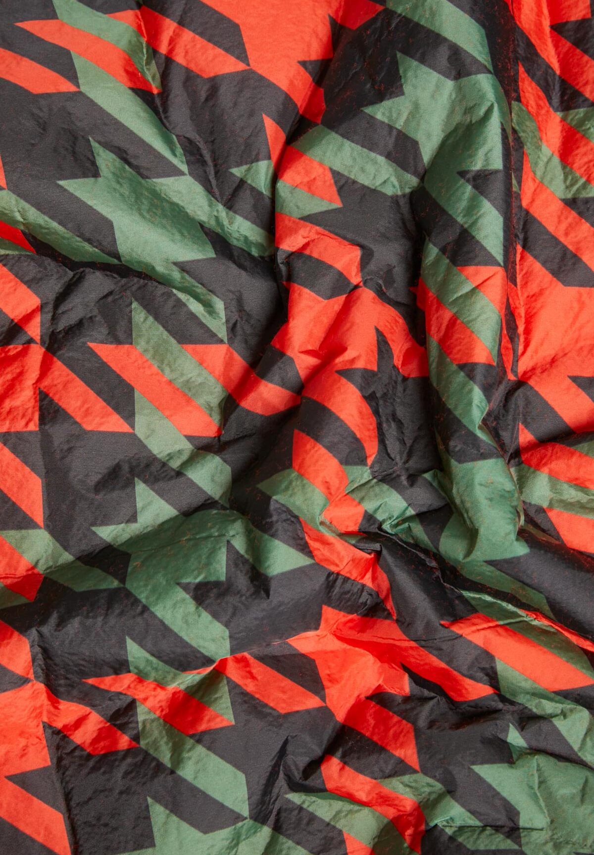 Nylon super leggero stampato in digitale e accoppiato con ovatta riciclata e un pile a rovescio.