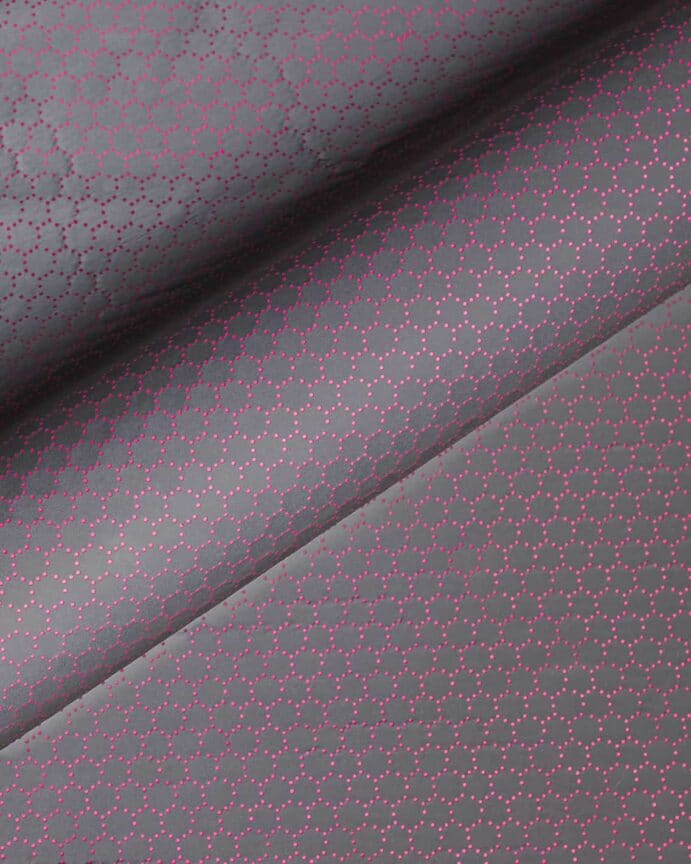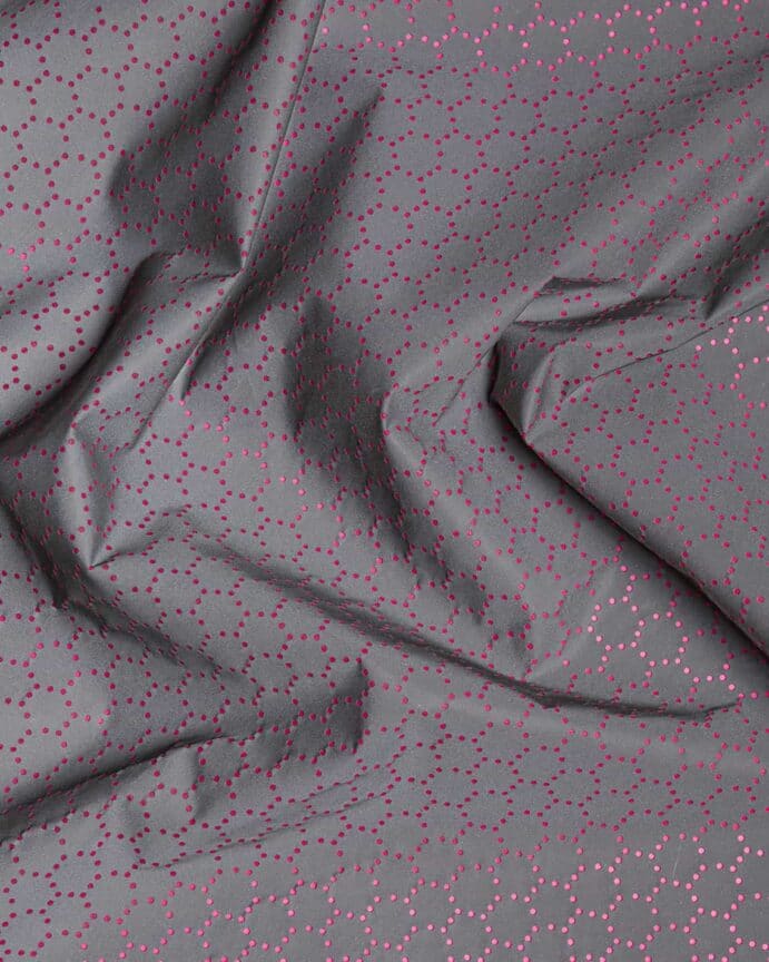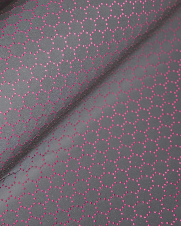 Articolo riflettente perforato e accoppiato con una membrana colorata, che rende il tessuto molto tecnico e waterproof.