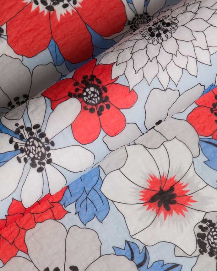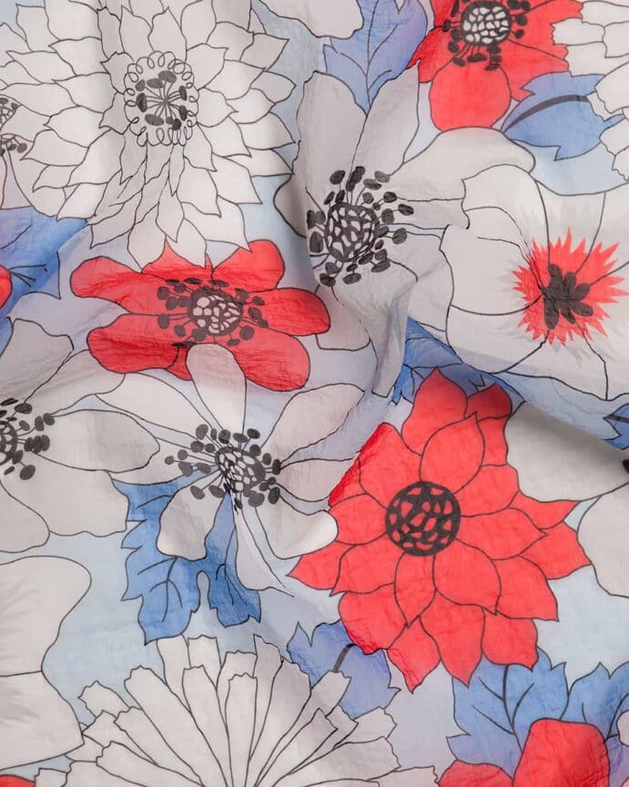 Organza super leggera trasparente stampata in digitale. Personalizzabile con qualsiasi pattern.