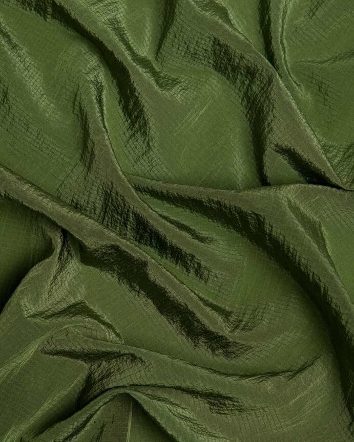 Ripstop di medio peso con una trama nera: il finissaggio mosso dato in tintura rende il tessuto ancora più tridimensionale e voluminoso.